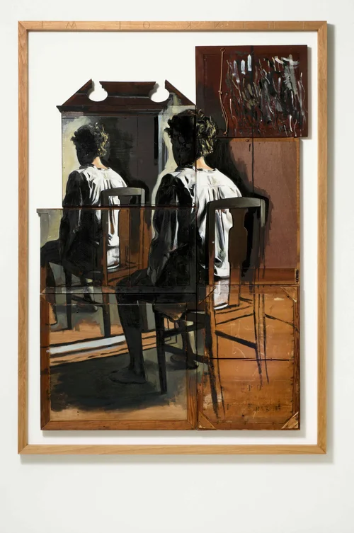 ‘Think of Me’ depicts a double self-portrait of the seated artist viewed from behind. He appears to be looking in a mirror, yet sees not his reflection but the view the observer is confronted with: the back of his head, thus calling into question the artist’s sense of identity. The work is clearly a homage to Magritte but by Clegg painting the image on an assemblage of found mirrors it is as if he is being judged against the others who have looked in these mirrors before him; the work is pregnant with the artist’s sense of emotional conflict, and with the dreams and everyday concerns of all those who have peered into the mirrors.